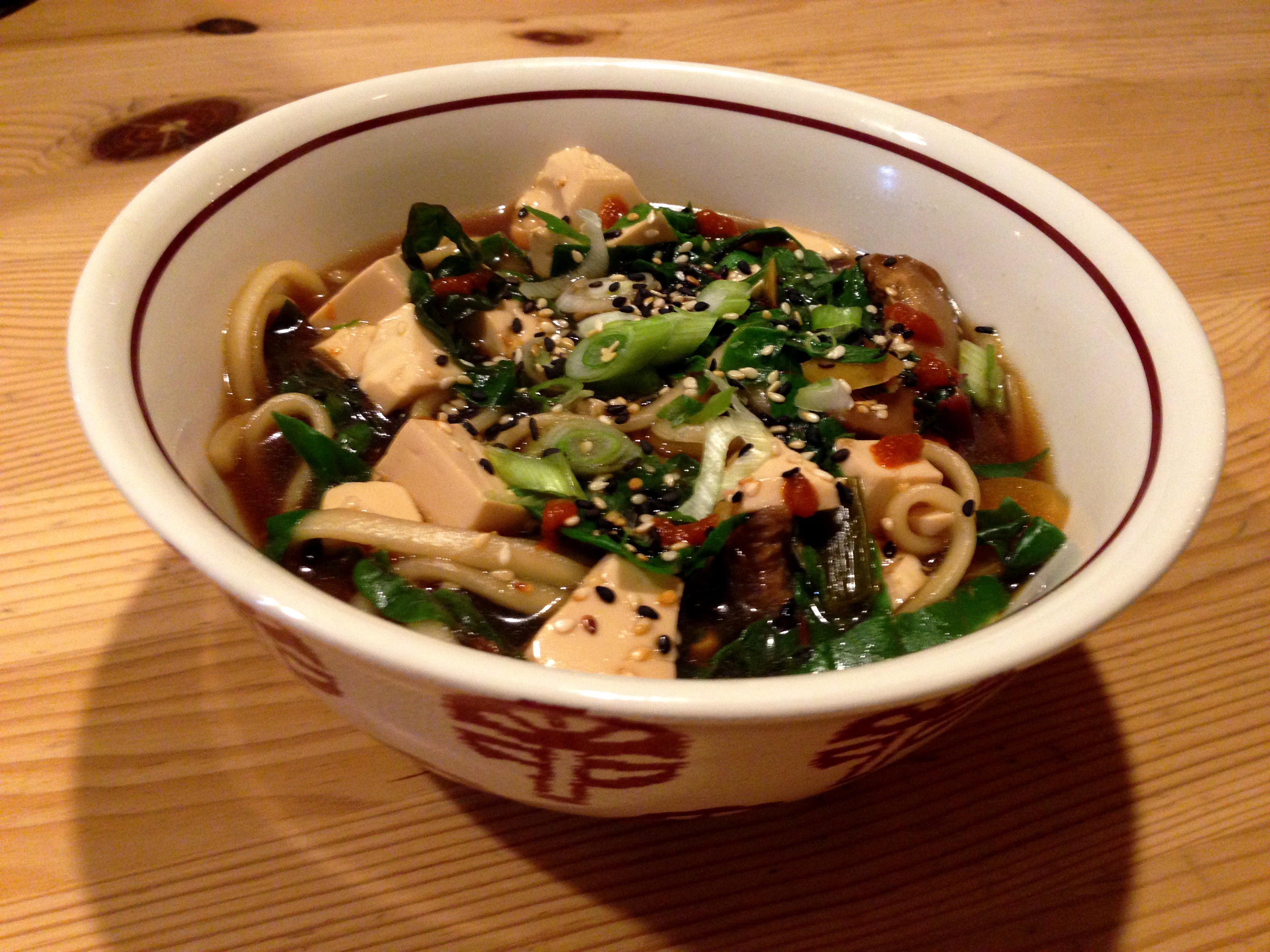 - Add the cubed tofu, cooked Udon noodles and greens, simmer