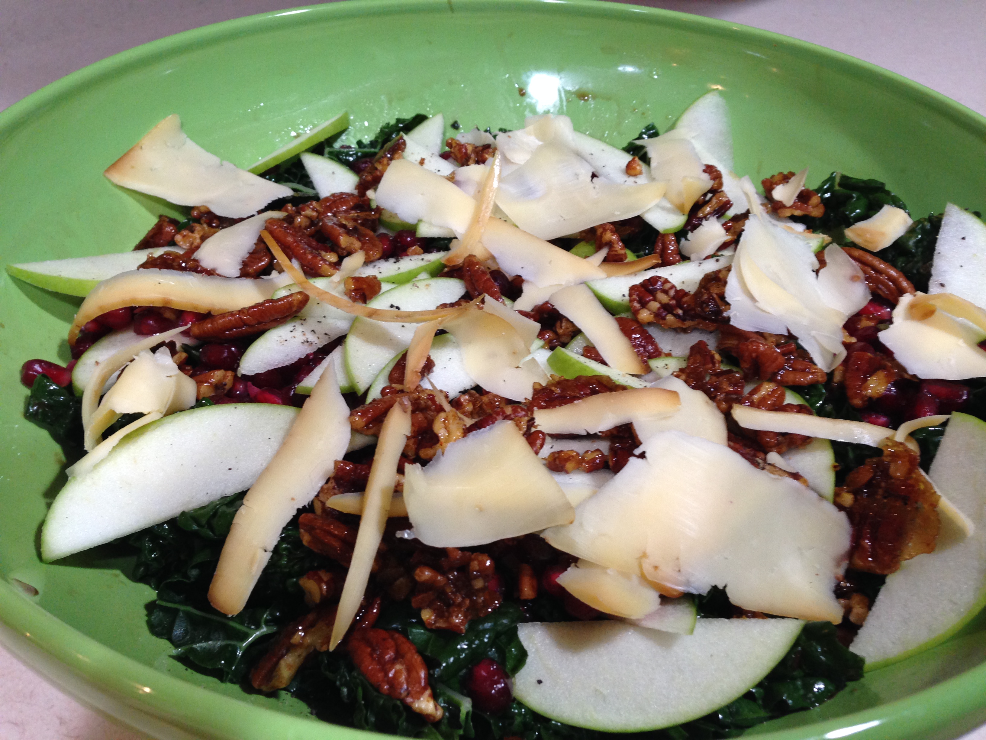 - Top with pomegranate seeds, apple, pecans, and gouda