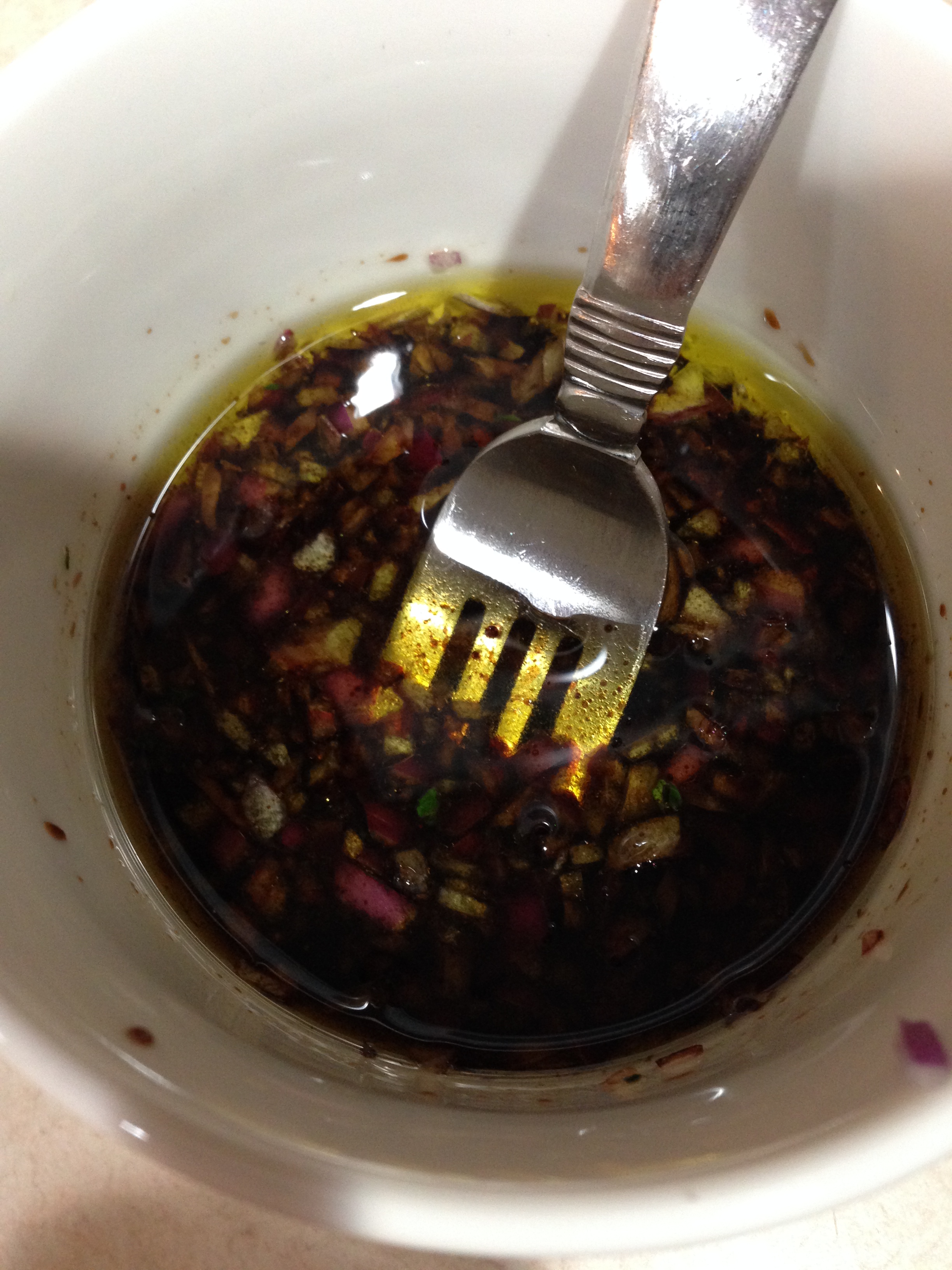- Dressing – 2 tbs olive oil, 2 tbs balsamic vinegar