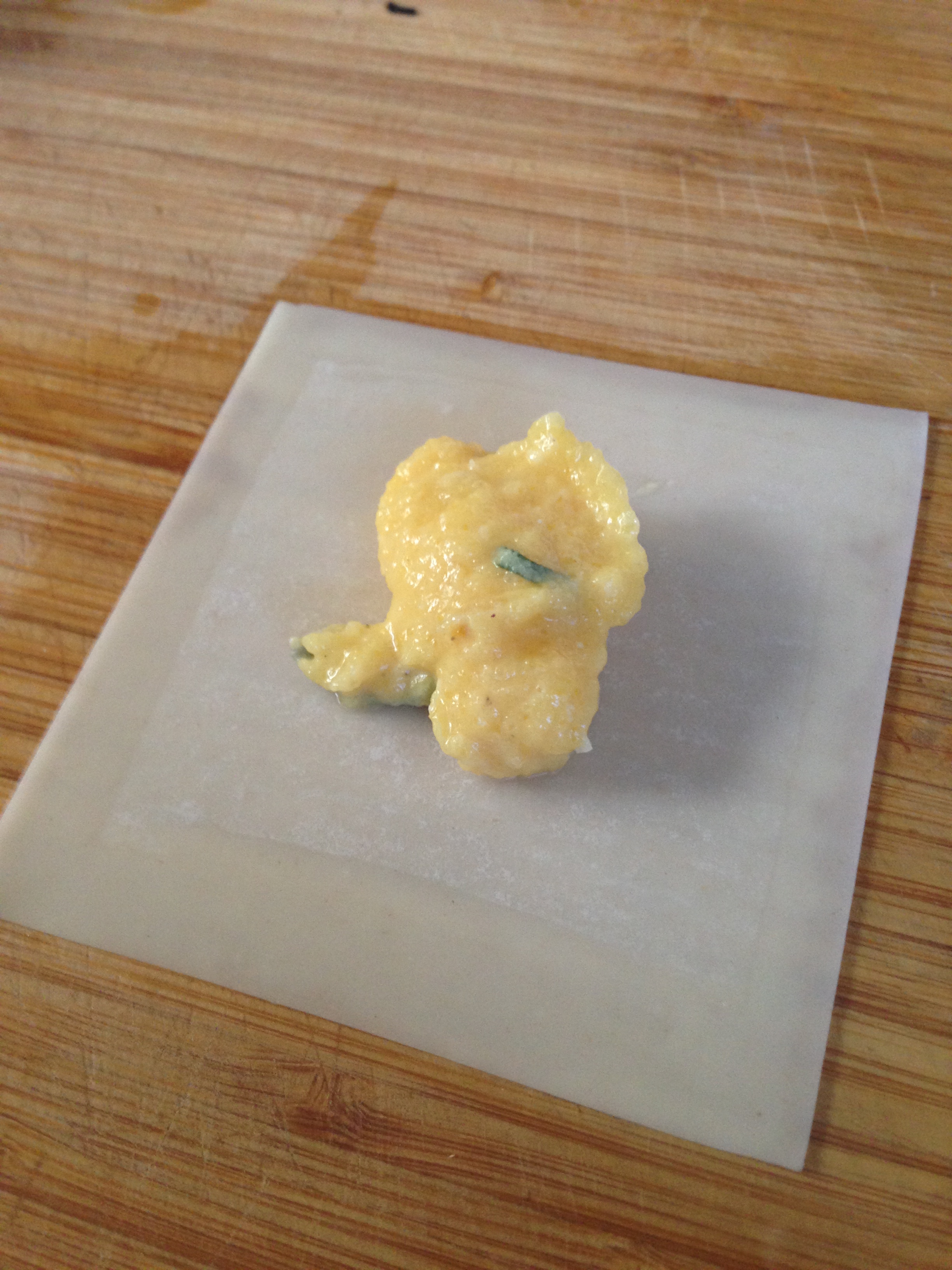 - To make the square – take 1 wonton sheet, and place about 1 1/2 teaspoons of filling in the center. Use a brush or your finger to run a bit of the egg wash around the edges. Next, carefully place a second sheet on top. Use your fingers to press around the filling in the center to remove air pockets, then line up the edges and press to seal.