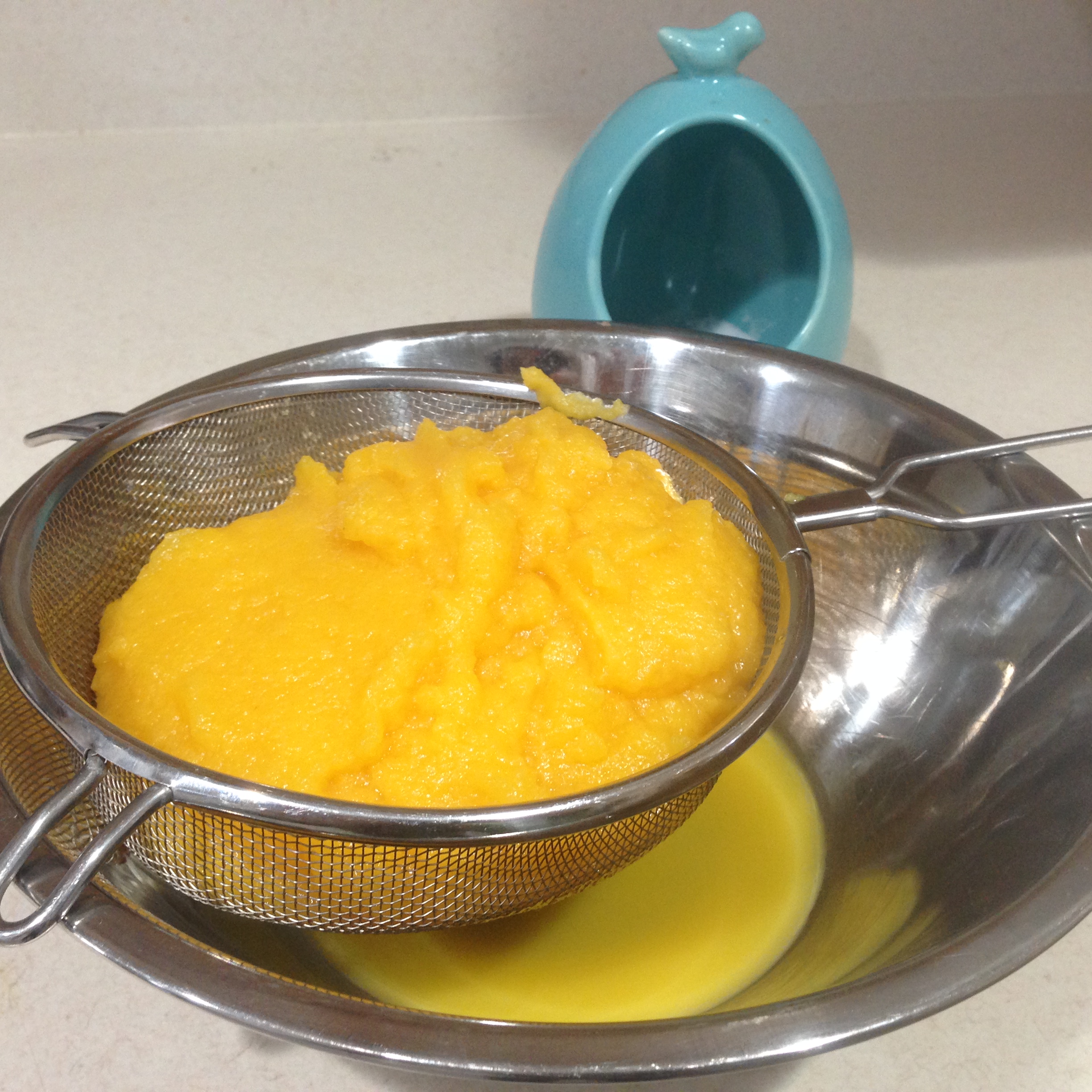 - Place the puree in a strainer over a bowl for about 30-45 minutes (because pumpkin has a lot of moisture this step helps the puree have a better texture to work with)