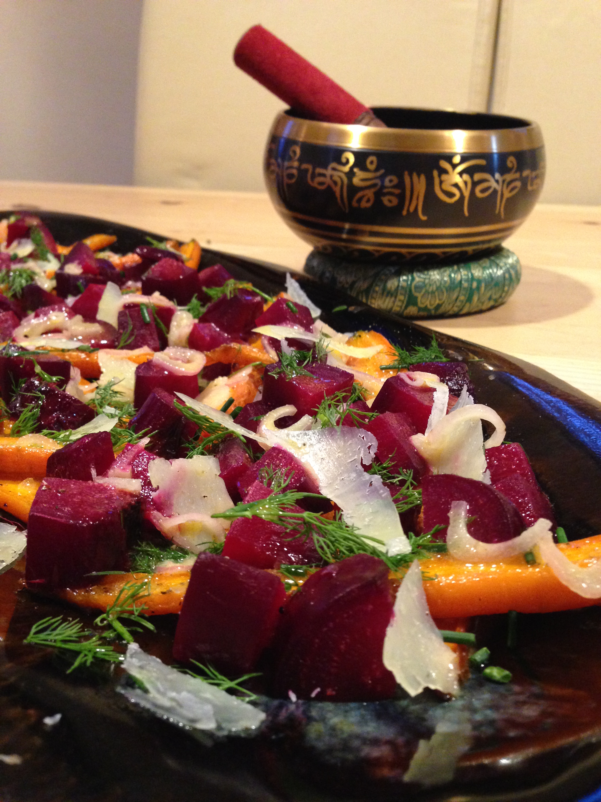 - Assemble the salad by placing carrots on a platter, layer the beets, cheese and herbs on top then sprinkle with dressing