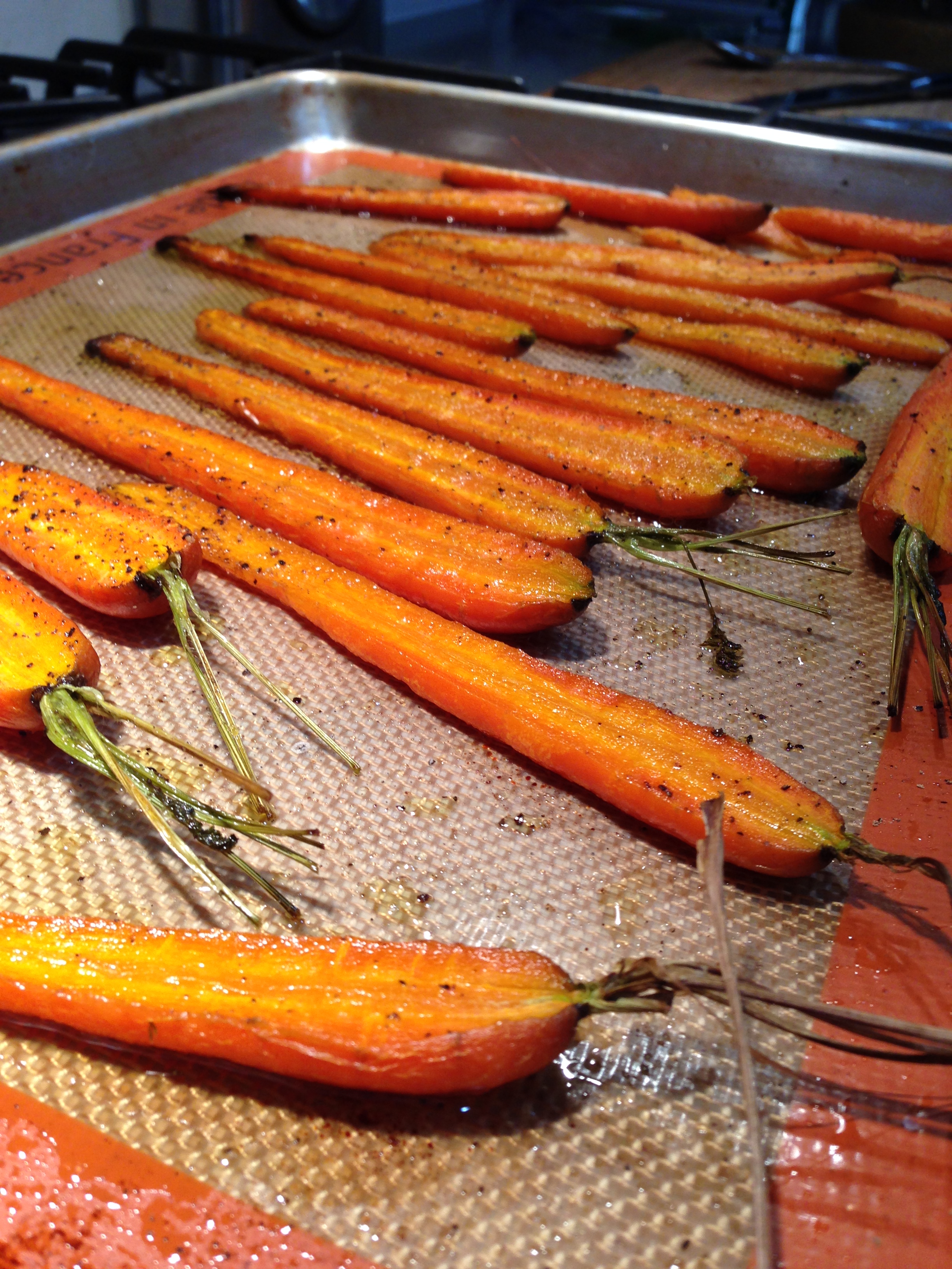 - On one sheet pan lay out carrots, drizzle with oil, and salt and pepper to taste