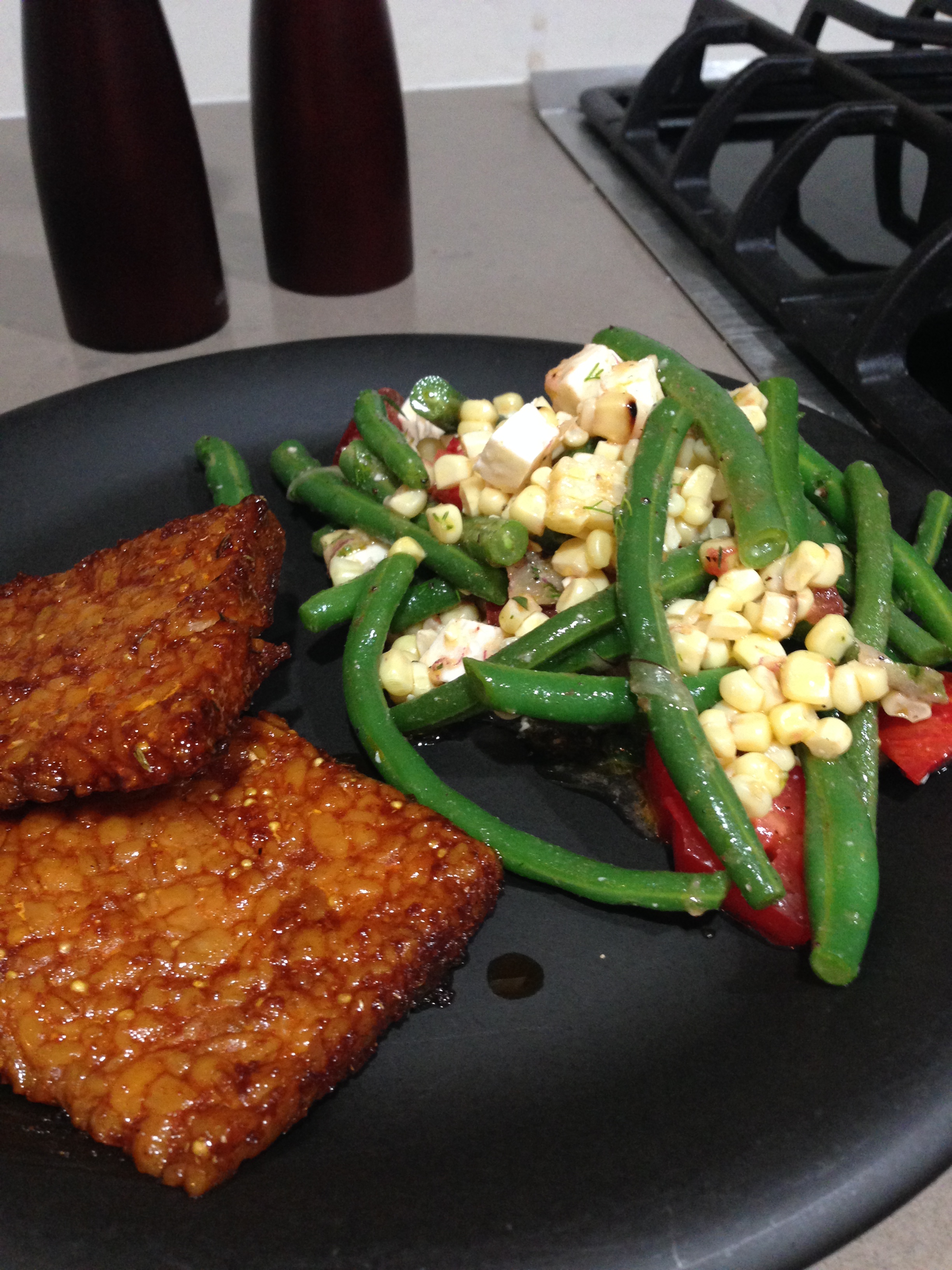 Crunchy steamed green beans are the star of this dish. I like to just trim them so they are quite long – if you prefer more bite size beans feel free to chop them up. I also marinated some feta in oil with dill and oregano that turned out really nice for some depth of flavor. Add some grilled corn and chopped heirloom tomatoes and it is summer in a bowl! This is all tossed in a simple vinaigrette. I have really been enjoying the nutty taste of the Flora 7 Sources oil and using it a lot in my salad dressings, give it a try!