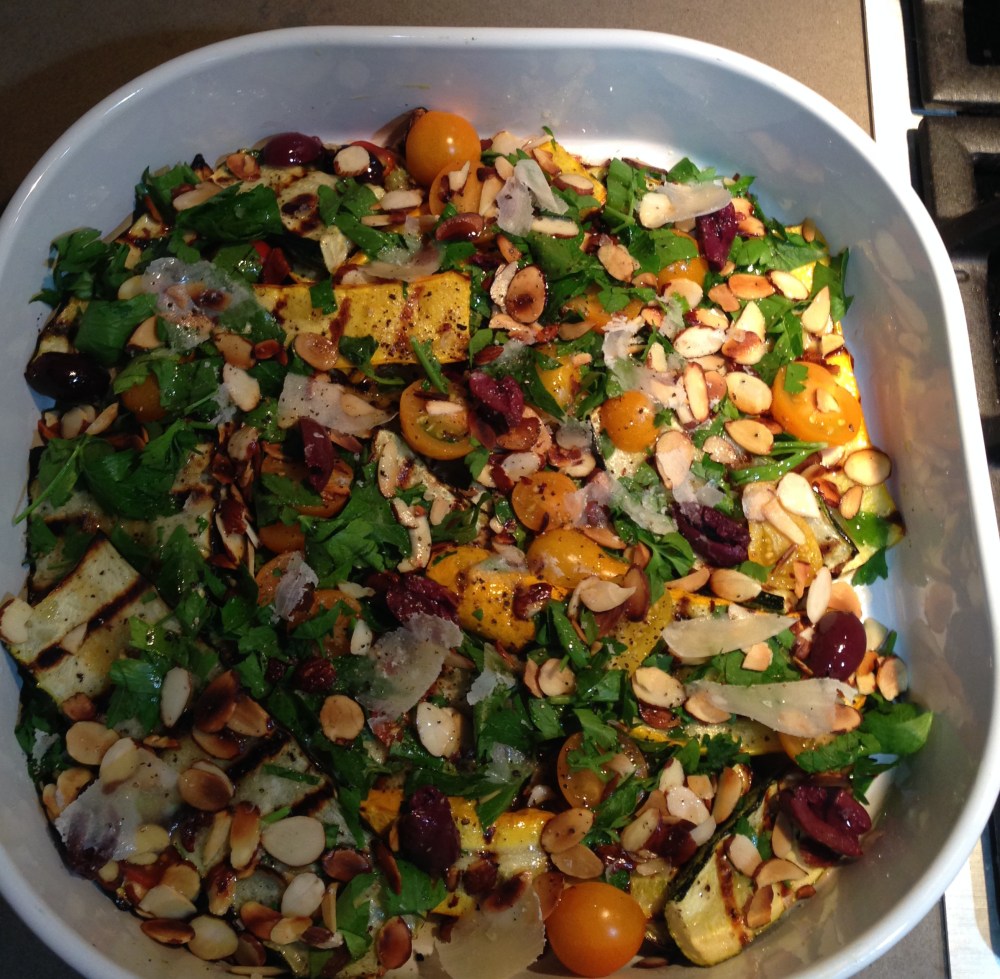 Pile squash on a platter- Top with tomatoes, olives, parsley, and almonds