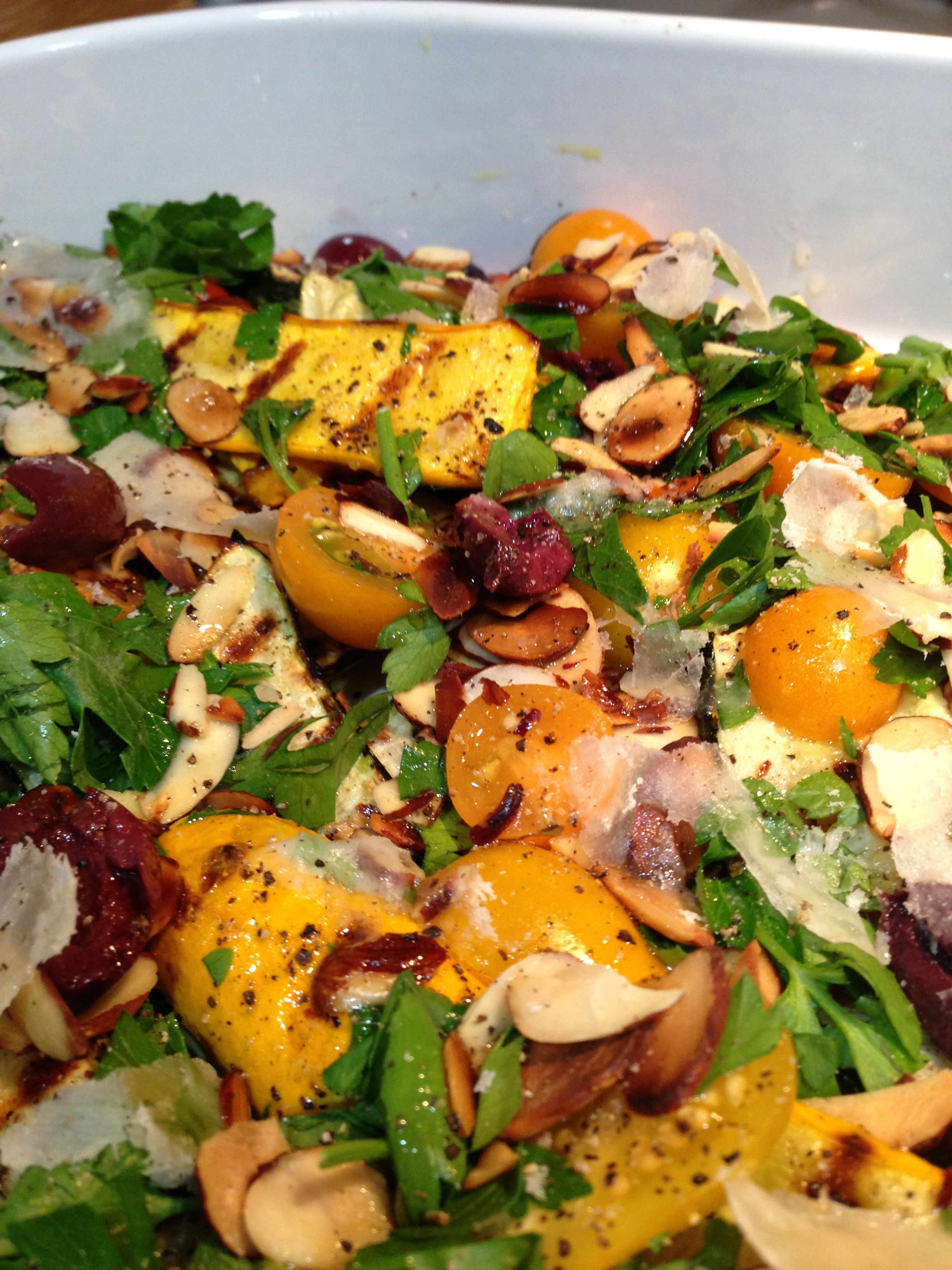 I have a couple of heirloom squash plants in the garden that have been producing like crazy. I love grilling summer squash and this salad combines a pile of squash, some ripe cherry tomatoes, and fine shavings from my new favorite cheese of the summer. Add a little crunch with some toasted almonds and some walnut oil and it is dynamite! It has become my favorite new dish to take to a BBQ or potluck. It tastes great hot, cold or room temperature and travels extremely well.