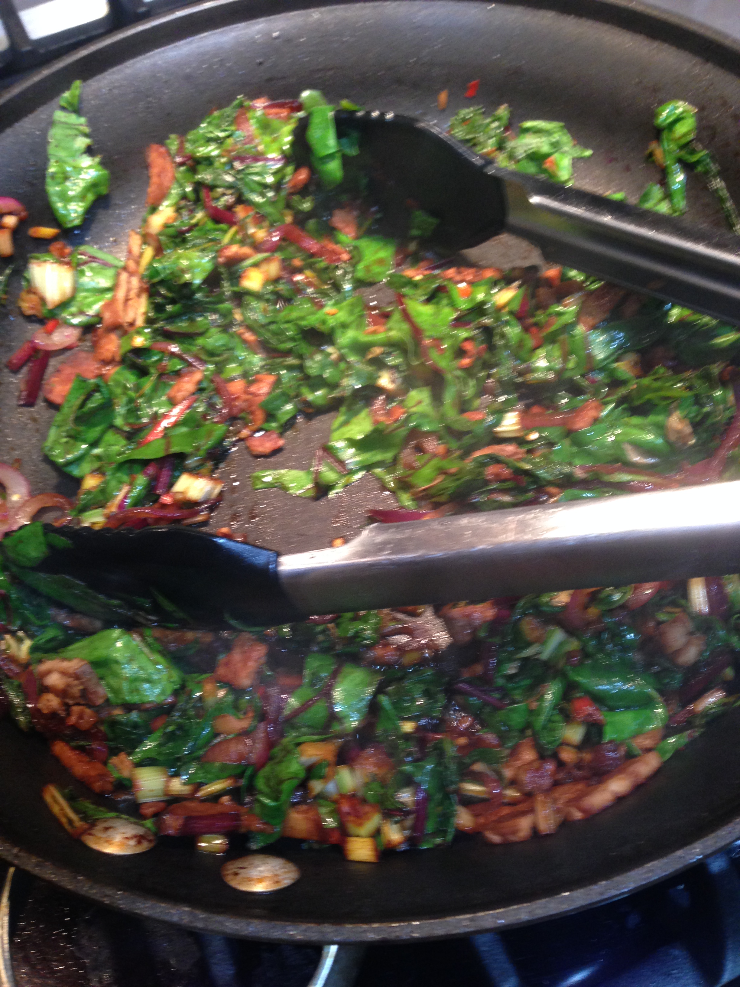 - Add the garlic, soy sauce, and red pepper flakes and cook until greens are wilted