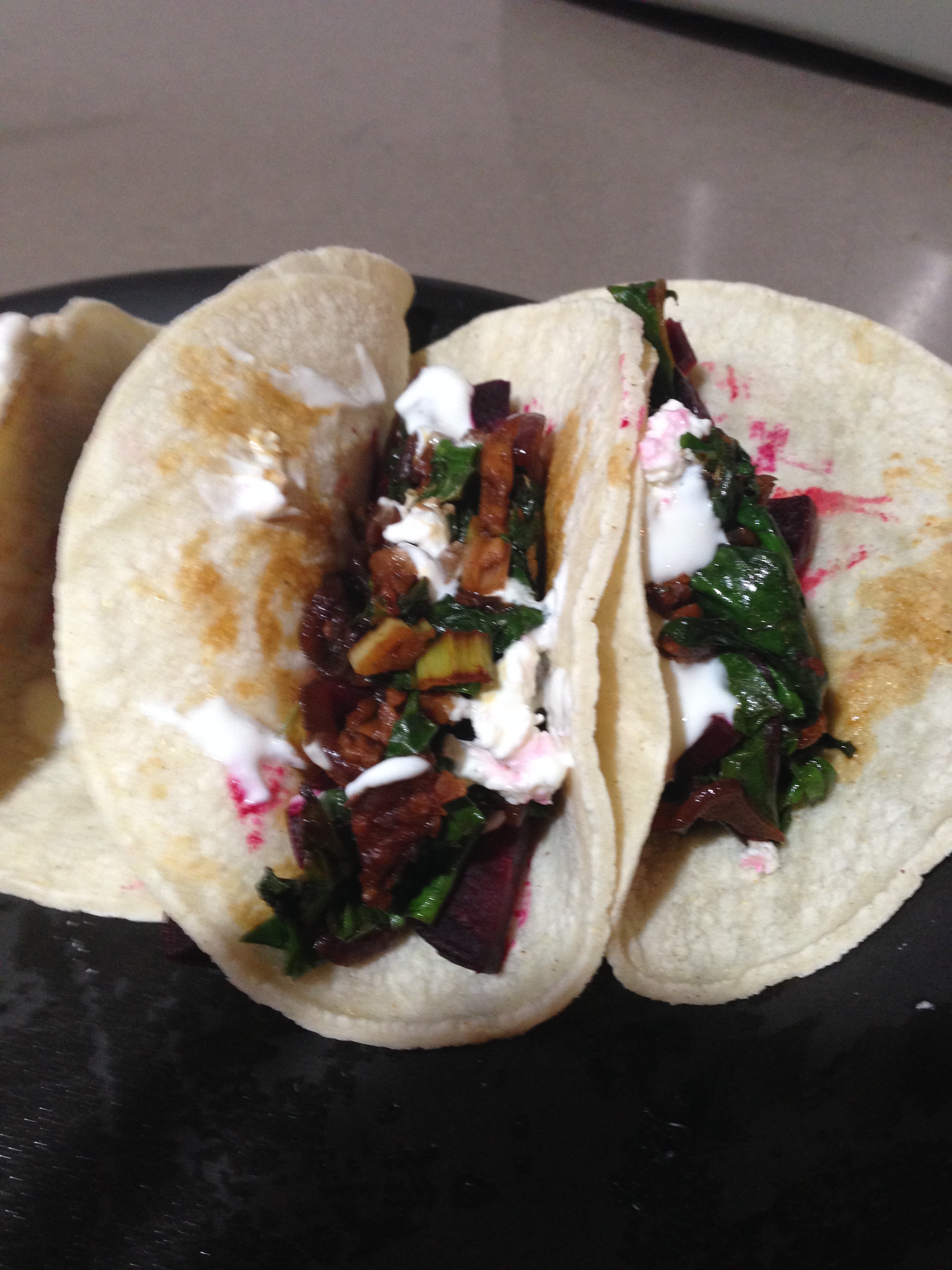 The idea for these came from a spring break ski vacation last year in Salt Lake City. My friend took me on a couple of amazing tours in the Wasatch and one day we finished up at a great new taco shop that had sprung up since I had visited last. They had some wonderful unique options. One was a beet, pear, and blue cheese concoction. I put my own spin on it including some crunchy bits of tempeh “bacon”, roasted beets and their greens, some sweet onions and salty local feta. This was Rob’s sendoff to Leadville!