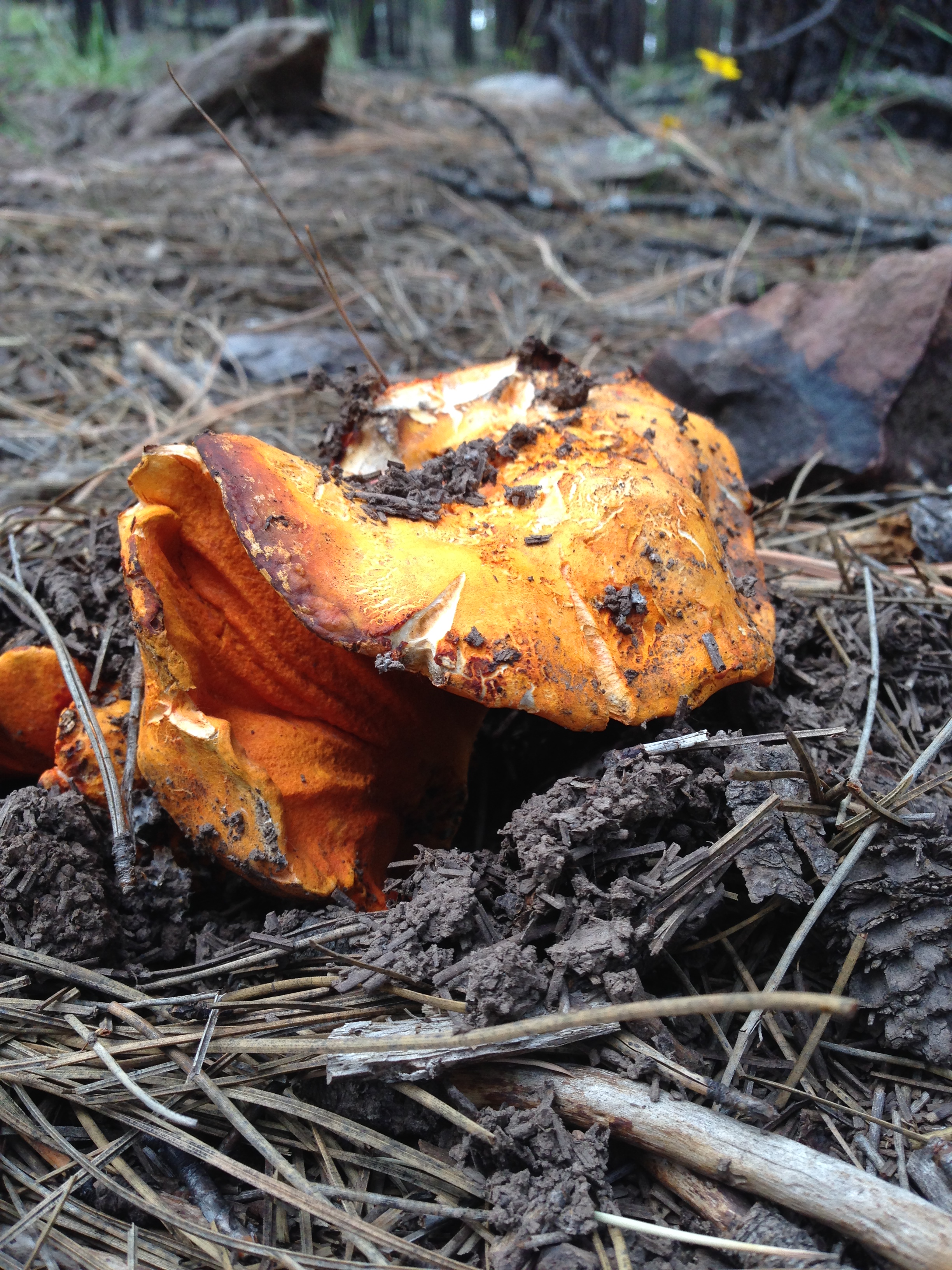Everyone needs a break sometimes. I have taken to my mountain bike a lot lately as running has been hampered by a calf injury. Riding through the forest there are mushrooms everywhere! Lucky for us many happen to be lobster mushrooms. These orange beauties are easily recognizable and nothing else looks remotely similar. They grow under the ponderosa pines and it is easy to spot a bright orange beacon pushing up through the pine needles. Sometimes they take a bit of cleaning but it is worth it! We are usually able to collect these from late summer through early fall. Cooked up with eggs, or simply sauteed, they have a marvelous flavor. It is so easy to bring along an empty backpack and stop for a few minutes and bring home a full load. After work a few weeks ago I did just that and cooked them up for a vegetarian taco filling that we brought to a potluck to celebrate Rob’s