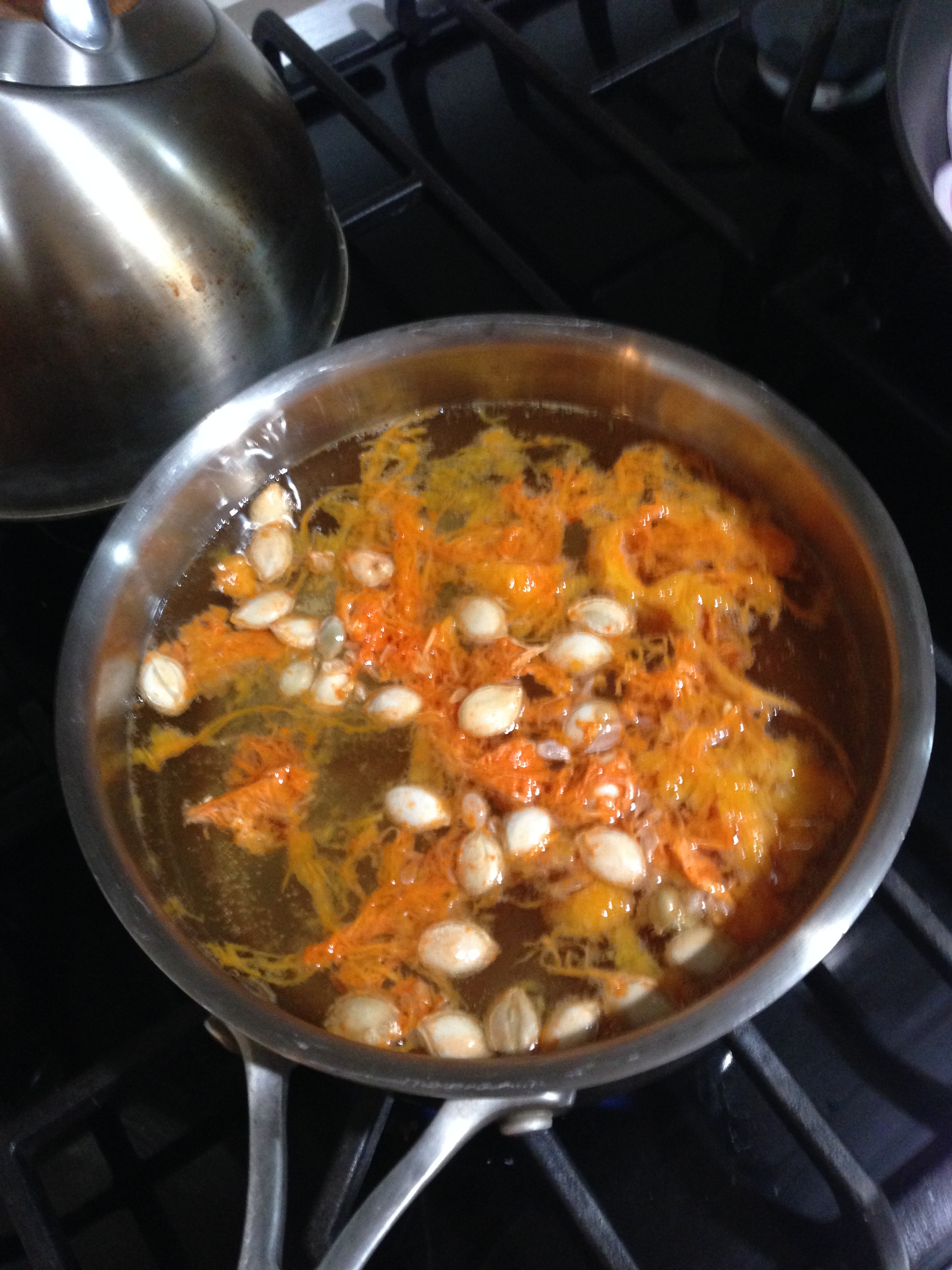 beginning to brown, reduce heat and continue cook stirring frequently until very soft and limp, about 15 minutes. Scrape into a bowl and set aside. - Meanwhile add 6 cups water to seeds, bring to a boil and let sit for 10 minutes, strain and pour into a large heavy bottomed pot