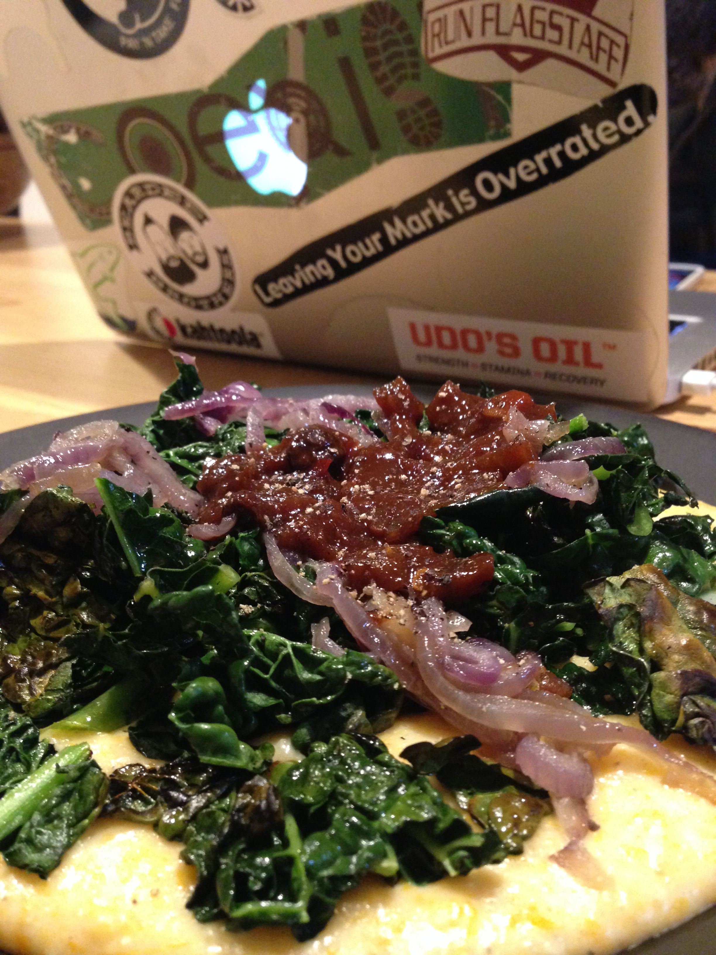 - Spoon polenta onto a plate and top with greens, onions, and chutney.