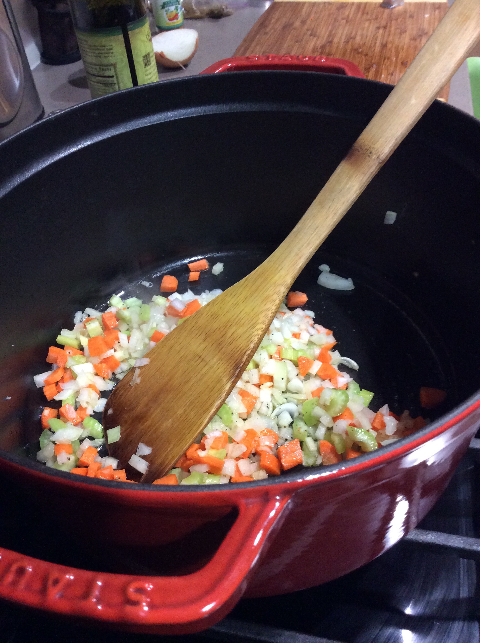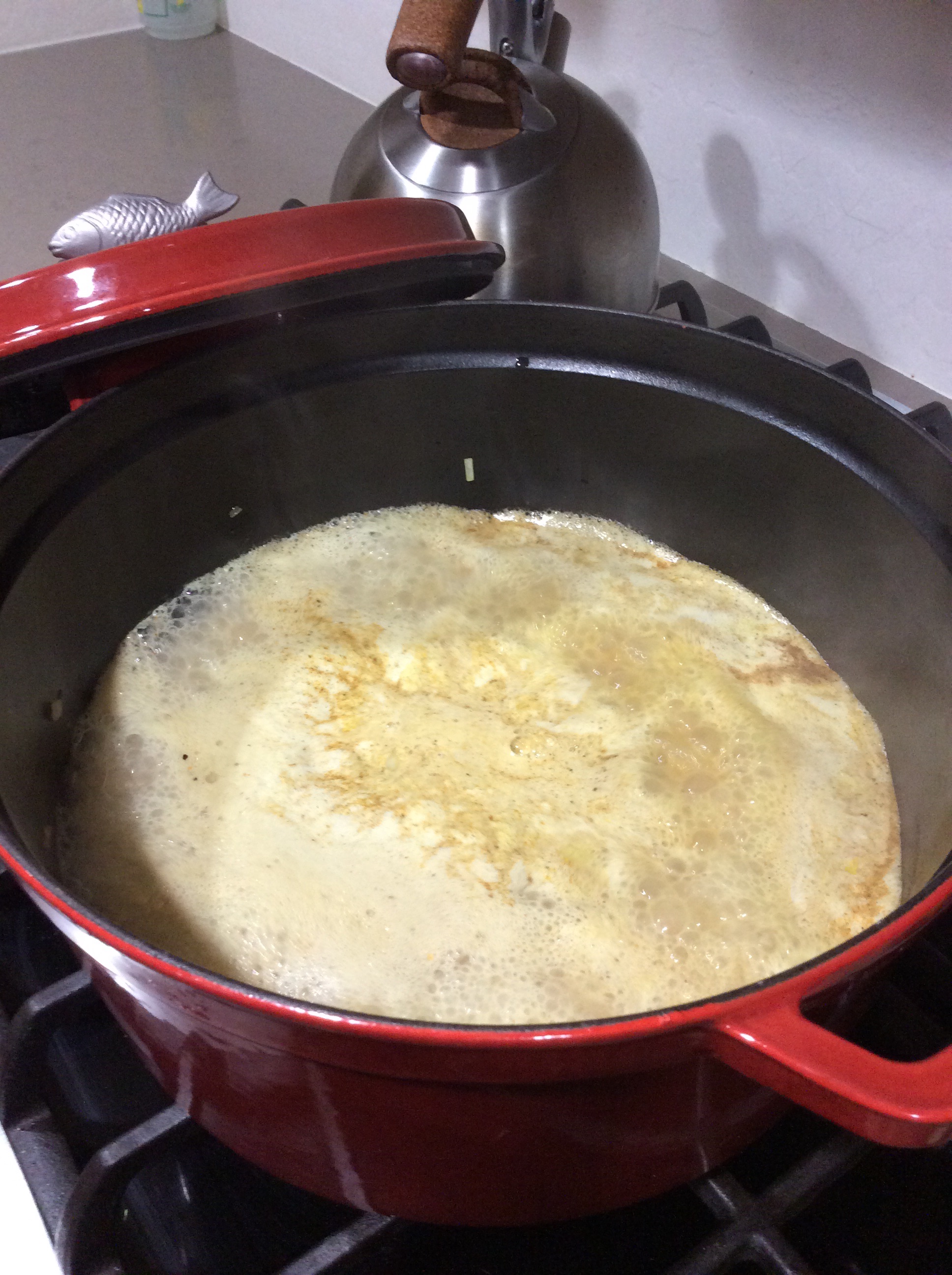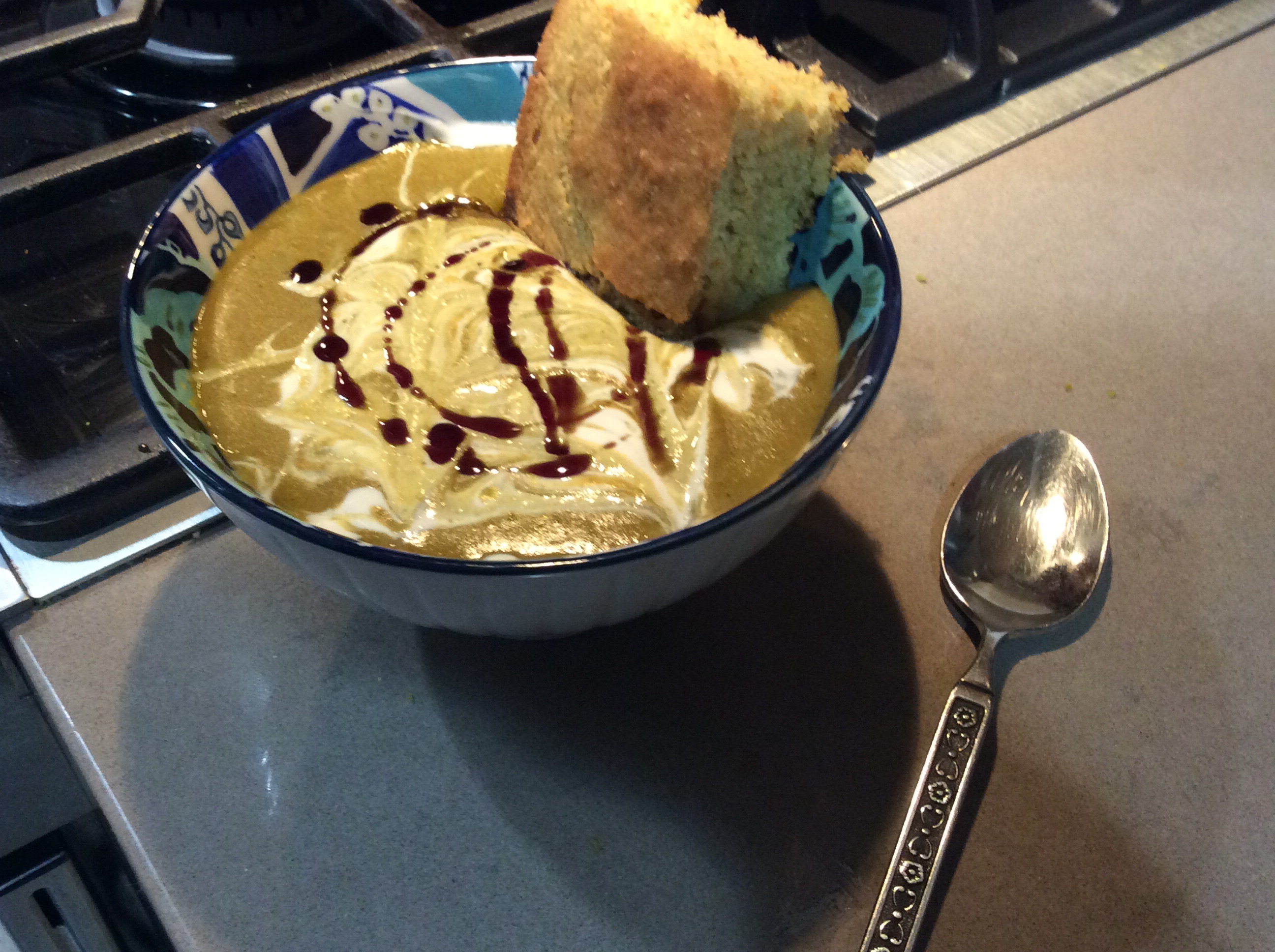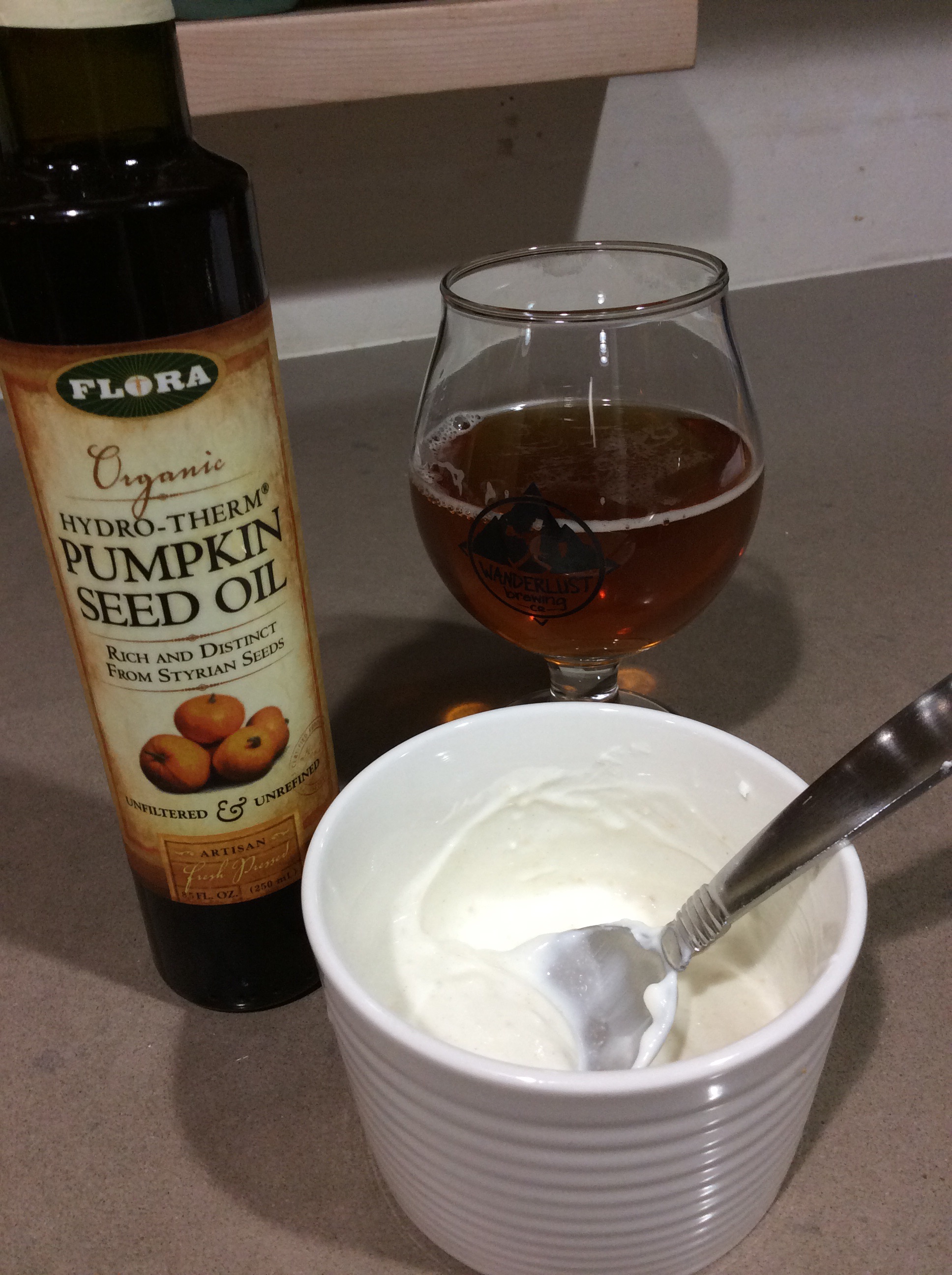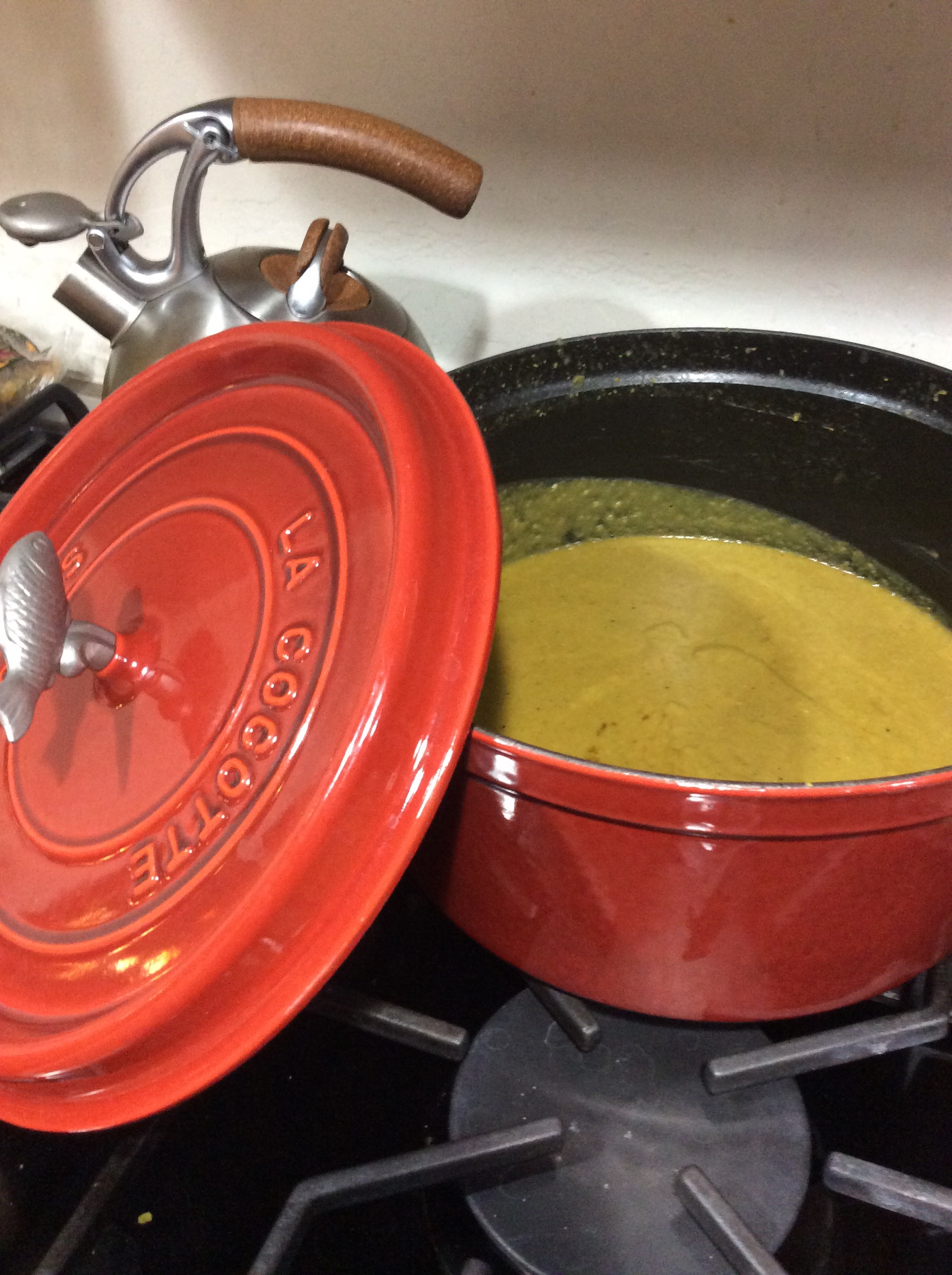 This recipe is for those days when all you want is soup. Doesn’t everyone have days like that? When the temperature plummets sometimes that is all that I want, a big pot of warm soup simmering on the stove without any fus. Maybe that has also been encouraged this year with the addition of a new wonderful, beautiful pot that I have taken to calling big red. Here in Flagstaff we are finally getting the snow we have been waiting all winter. This storm has gifted me some extra days off (yeah snow days!). While I often take these to cook up something elaborate after skiing, yesterday all I wanted was my mom’s split pea soup. This soup is easy and cheap! I added a few twists that really amped up the flavor – a can of light coconut milk, double the curry powder, and a healthy swirl of pumpkin oil on top. This nutty deeply flavored oil is a new discovery and is the perfect addition to this soup. Find the Flora oil I used here. I know it will be finding its way into many a salad this summer! It also pairs nicely with my traditional soup topping – greek yoghurt swirled with horseradish or wasabi paste, and a great beer of course!