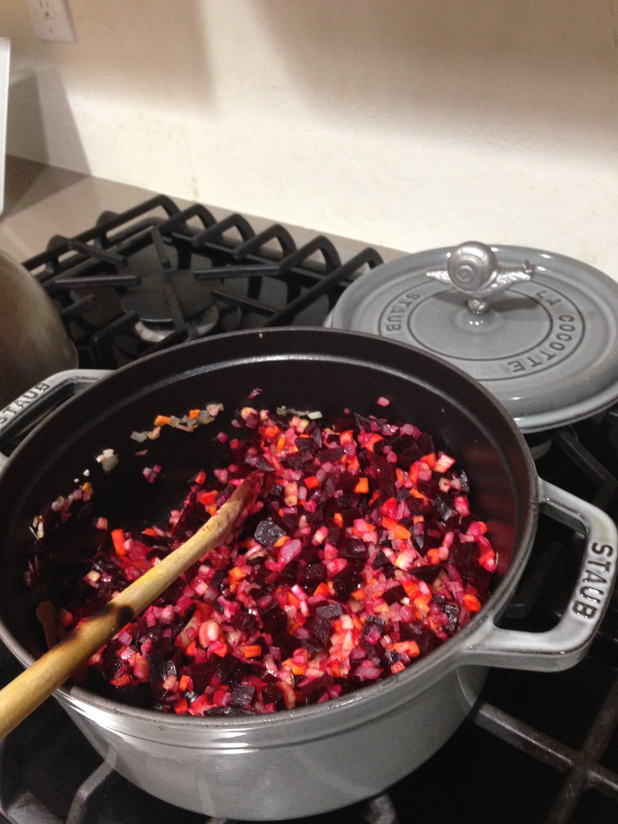 - Add the diced beets, bay leaf and allspice, saute gently for 10 minutes, add a little of the broth if too dry