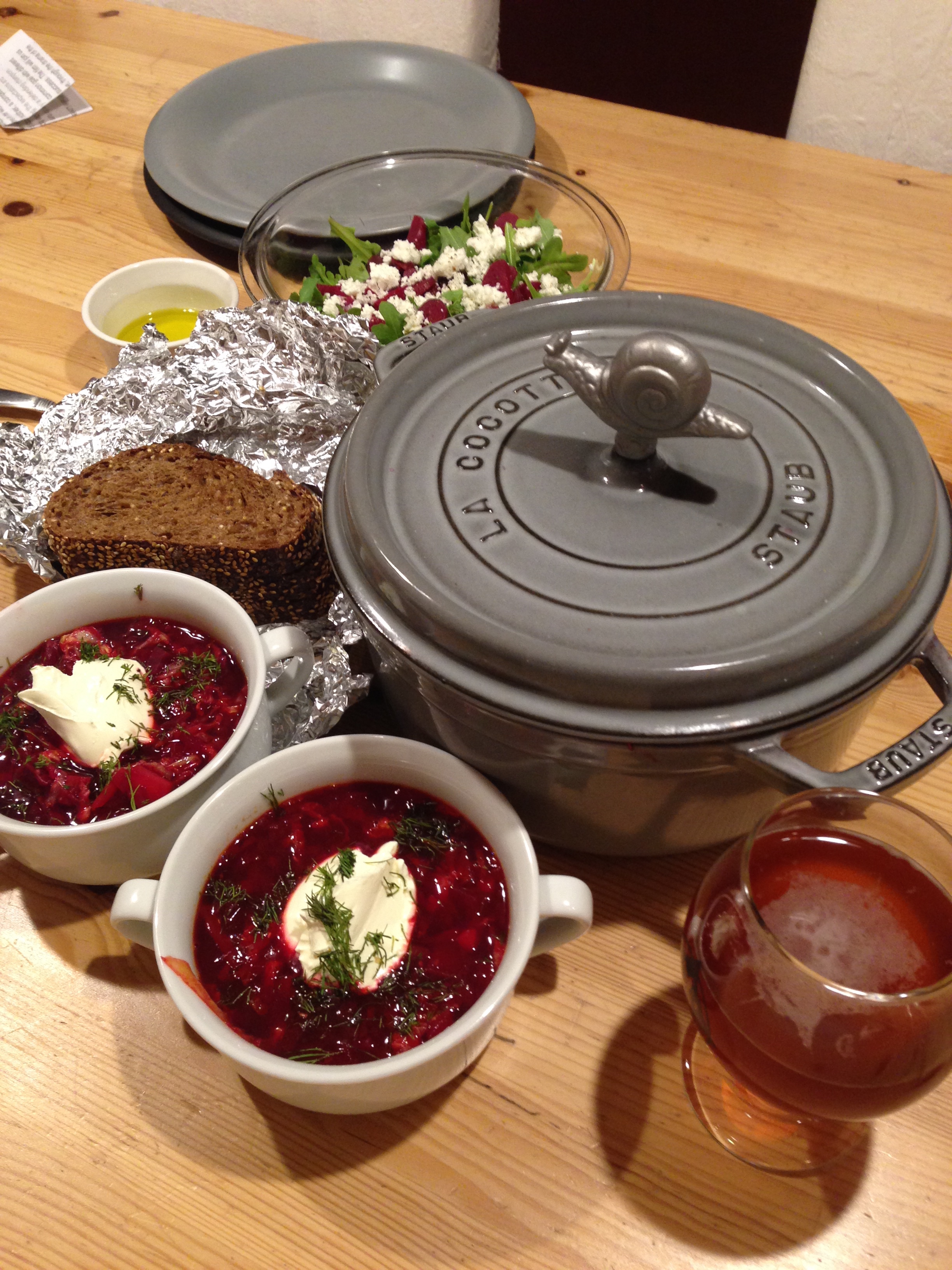 I did some internet surfing to get an idea of how the soup might be made and came up with my first try. Borscht is an art – I think I might just spend my life perfecting this recipe – sweet, sour, earthy it has such complex flavors. This version is relatively light, the broth is made up of beet crystals which really amps up the lovely red color and subtle earthy flavor. Potatoes add a little bit of depth and the beets are roasted first. Cabbage is added late in the cooking process – if my beets had nice greens with them I would have added those too. The soup is topped off with sour cream and dill and accompanied by some warm buttered pumpernickle bread. We added an arugula salad studded with my own pickled beets and some creamy goat cheese. Some of the pickling liquid helped to amp up the tang in the soup – I think apple cider vinegar would be equally good. I have plans to add some shredded raw beet right at the end next time, or some southwestern spicy heat like green chilis, and may experiment with using other root veggies. One thing I will definitely keep is the beet crystal broth, such a nice subtle flavor. Find the crystals here. In the depths of winter I might mix this with some liquid from soaking dried mushrooms like porcinis – might add a “beefier” flavor. Can you tell I am excited about having a new recipe to play around with! Hope you enjoy this first spring rendition. We of course had some delicious Wanderlust beer as well – the Bier de Garde is delicious and complemented the soup wonderfully.