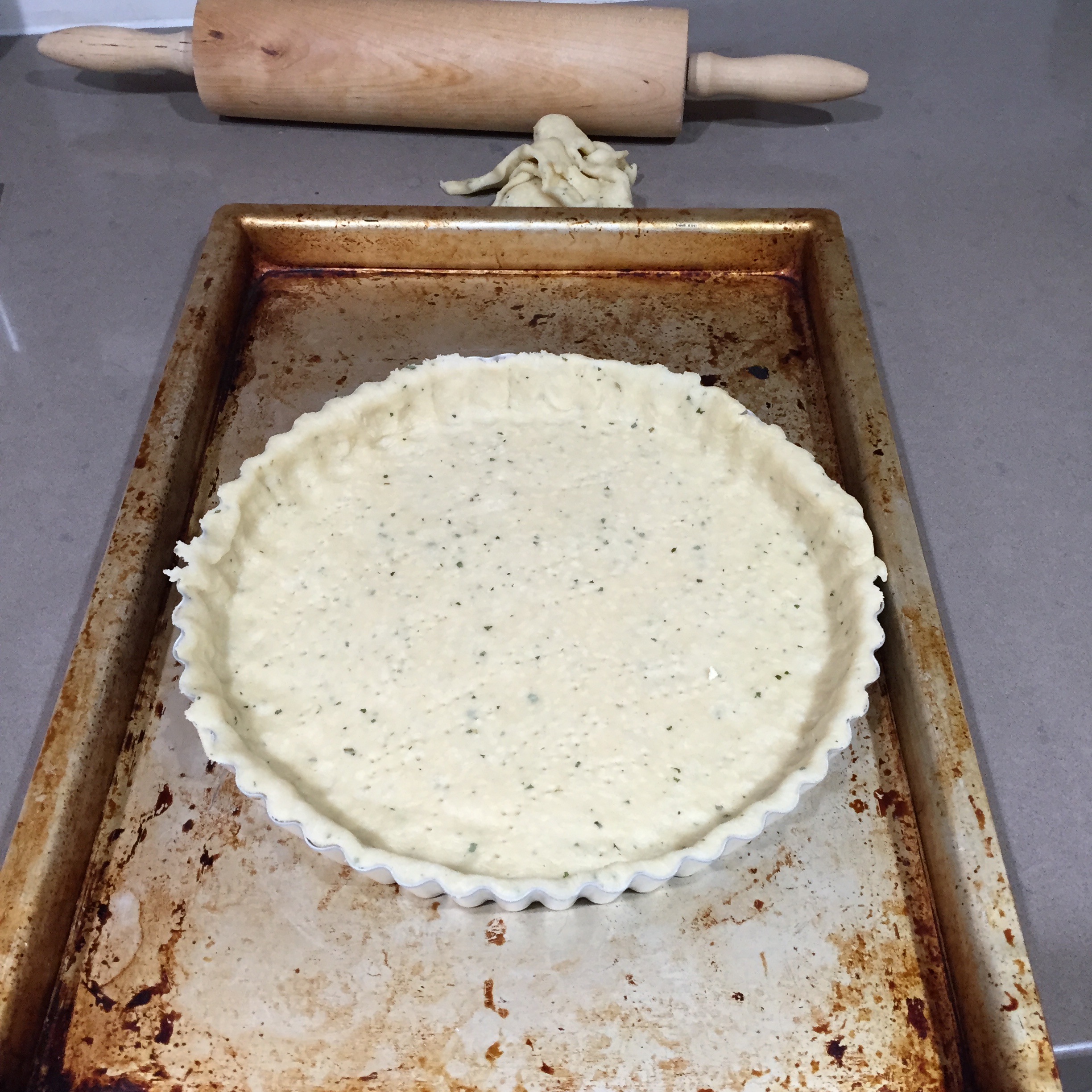 Mix together goat cheese and mustard using a fork- Unwrap and roll chilled dough into about an 11 inch circle – line a 9-10 inch tart pan with the dough – cut the excess off with either your knife or rolling pin