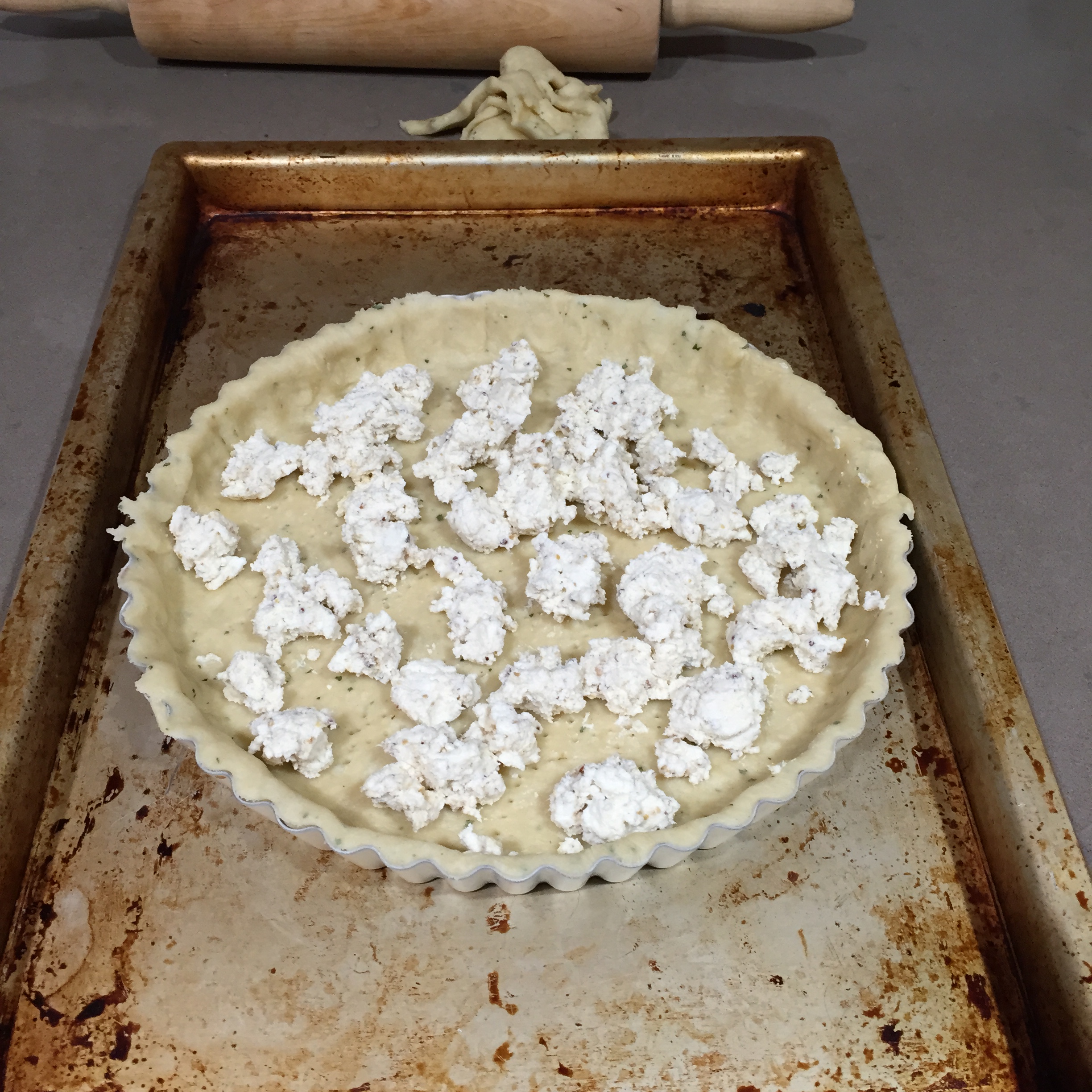 - Prick the bottom of tart shell with a fork and spread small clumps of goat cheese evenly over the shell