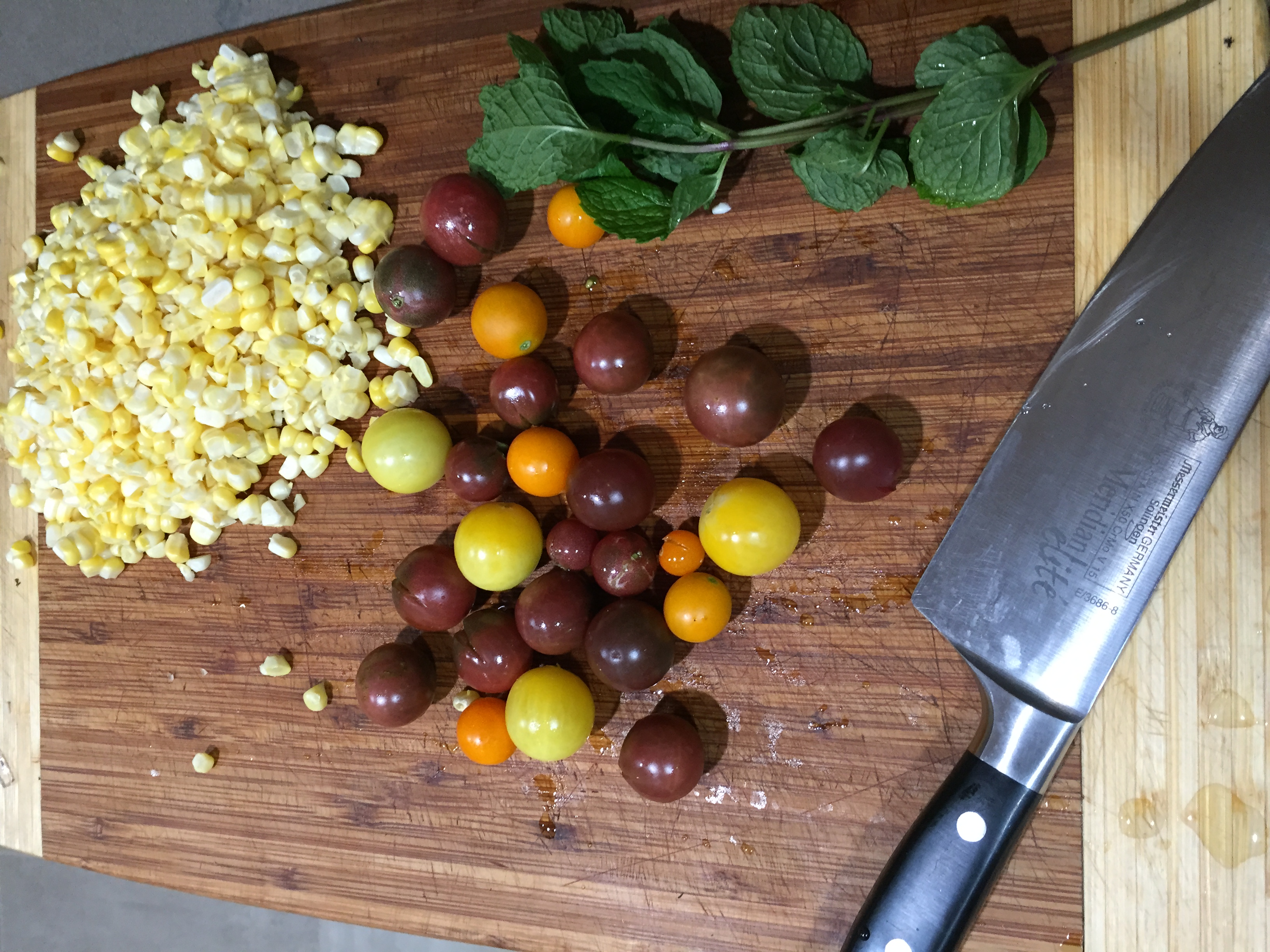 - Add okra and corn back to bowl stir in mint, basil, and chopped cherry tomatoes
